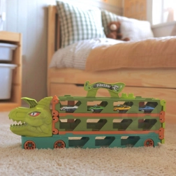 Der lustige Dino-Lkw ist eine hervorragende Wahl für Kinder ab 3 Jahren. Er enthält einen Lastwagen, der in eine Rennstrecke mit Dinosauriermotiv verwandelt werden kann und unzähligen Spielspaß bietet. Das Launchersystem katapultiert die Autos nach vorne, indem man den Knopf am Dinosaurierkopf drückt.
