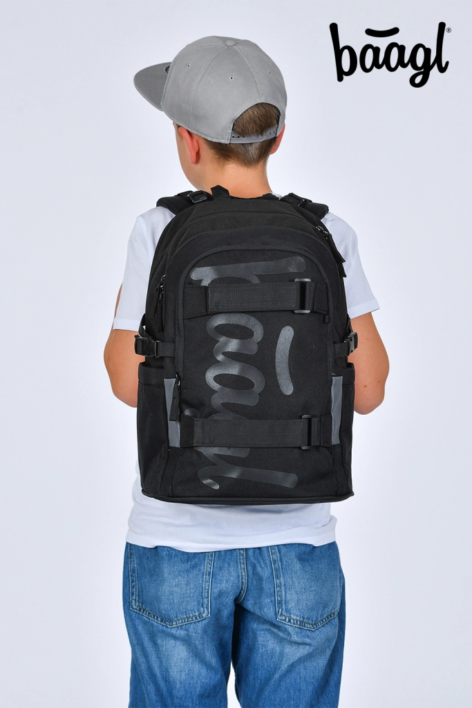 Der leichte und strapazierfähige Schulrucksack BAAGL Skate Uni in elegantem Schwarz ist ideal für Schüler ab der dritten Klasse. Er bietet anatomisch geformte Rückenpartie, 3 geräumige Fächer, ein gepolstertes Fach für ein 15"-Notebook sowie praktische Riemen zur Befestigung eines Skateboards. Hergestellt aus recyceltem, wasserabweisendem Material mit reflektierenden Elementen für maximale Sicherheit und versehen mit zuverlässigen YKK-Reißverschlüssen.