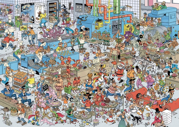 Tauchen Sie ein in die geschäftige Welt der Bäckerei aus der legendären Serie von JAN VAN HAASTEREN. Jede Szene ist voller Humor und unerwarteter Situationen – halten Sie Ausschau nach ikonischen Motiven wie der Haifischflosse, den wandernden Händen, der Zahnprothese, dem Heiligen Nikolaus und sogar dem Selbstporträt des Künstlers. Dank präzisem Druck und satten Farben macht das Puzzeln vom ersten bis zum letzten Teil Freude.