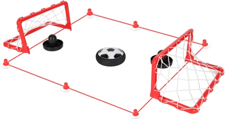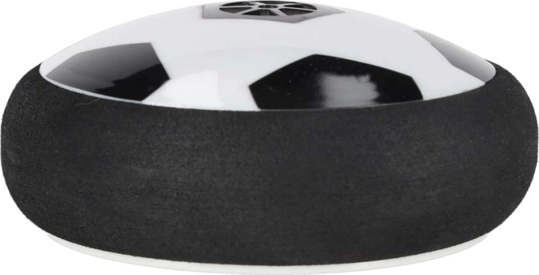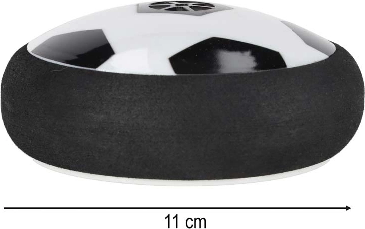 Der Ball im Fußball-Design leuchtet auf und bewegt sich dank Luftkissen sanft über Tisch und Boden. Ein weicher Schaumrand schützt die Umgebung.