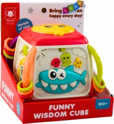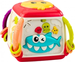 Der Würfel enthält interaktive Elemente wie Musiktasten und drehbare Zahnräder, die dem Kind stundenlangen Spaß und Anregung bieten.