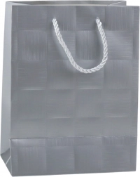 Suchen Sie eine repräsentative Geschenkverpackung? Diese Geschenktasche mit feiner, geometrischer Prägung in regelmäßigen Quadraten wirkt modern und zugleich zeitlos. Die stabile Oberfläche und die gedrehten Kordelgriffe in passender Farbe gewährleisten bequemes und sicheres Tragen auch schwererer Gegenstände.