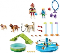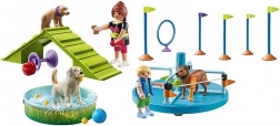 2 Kinderfiguren, mehrere Hunde, Hindernisse (Ring, Slalom, Wippe/Balancierstange, Rampen), Zubehör