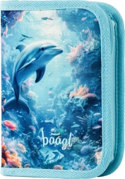Einlagiges Federmäppchen Delfin ist ein klassisches einlagiges Mäppchen mit zwei Klappen. Es verfügt über einen Markenreißverschluss von YKK, ein kleines Fach für Kleinigkeiten, ein Stundenplanfenster und besteht aus recyceltem Material.