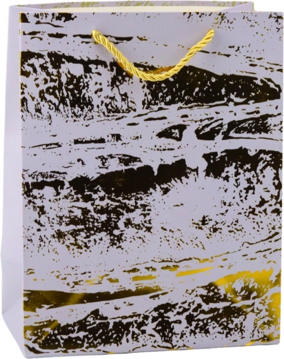 Diese elegante und zeitlose Geschenktasche in Silber mit unregelmäßigem goldenen Muster ist eine stilvolle Verpackung, die für sich allein Aufmerksamkeit erregt und den besonderen Charakter des Geschenks unterstreicht. Die goldenen Akzente schimmern wunderschön im Licht und verleihen der Tasche ein luxuriöses und modernes Erscheinungsbild, das dem Beschenkten sicherlich gefallen wird.