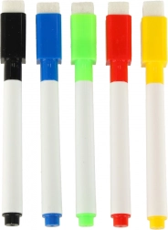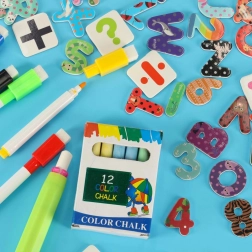 Enthalten sind verschiedene Lernhilfen wie magnetische Buchstaben, Zahlen, Kreiden und Marker.