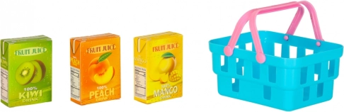 Im Korb verbergen sich Obst, Saftkartons, Fläschchen und ein Becher für Shakes – Kinder haben alles sofort zur Hand für ein fröhliches Picknick zu Hause und draußen.
