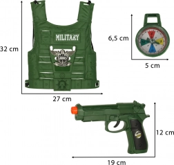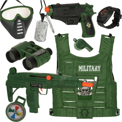 Das ultimative Militärset für kleine Abenteurer, das eine Weste, ein Gewehr, ein Fernglas und weiteres Zubehör für realistisches Spiel und jede Menge Spaß enthält.