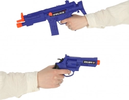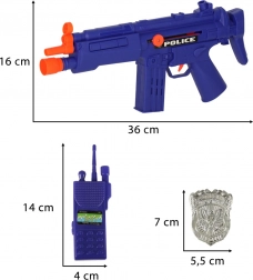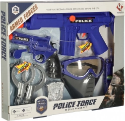 Dieses Set enthält grundlegende Elemente der Polizeiausrüstung, darunter Pistole, Karabiner, Handschellen, Maske und weiteres Zubehör für ein realistisches Spiel.