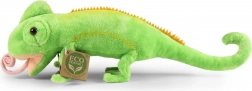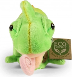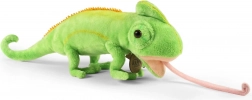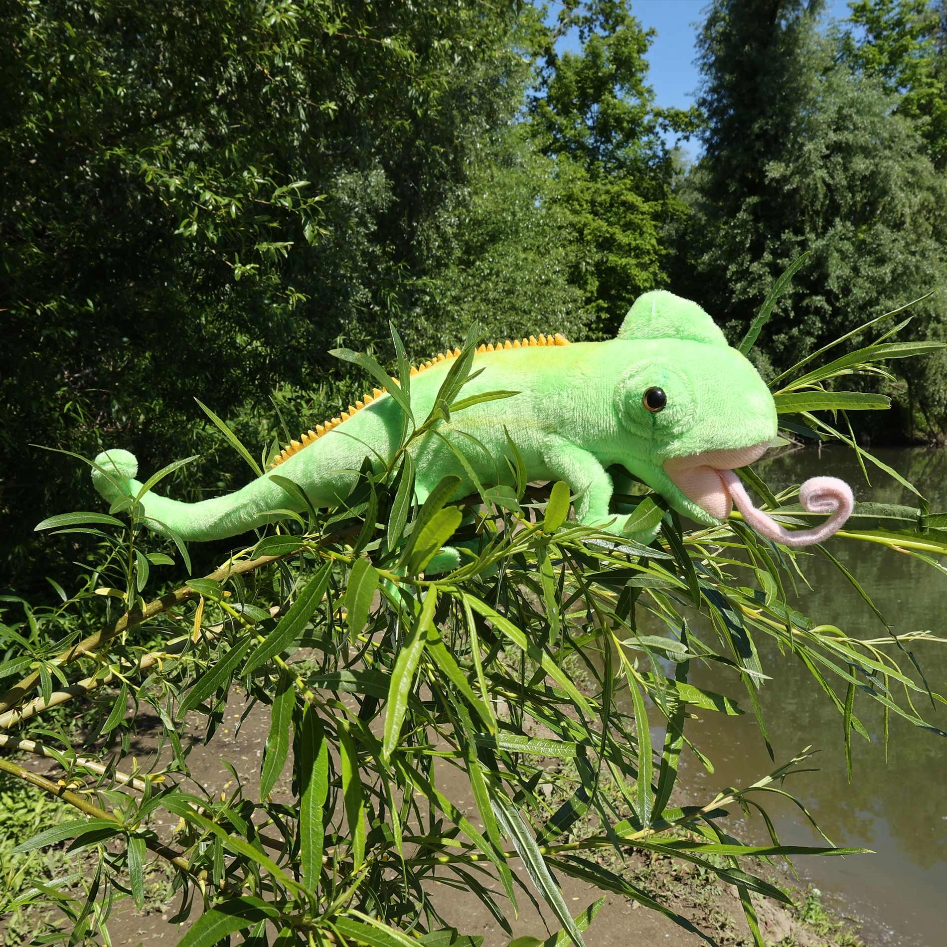 Gestickte Elemente, orangefarbene Rückenstacheln und eine niedliche rosa Zunge machen das Chamäleon zu einem treuen Plüschfreund.