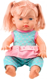 Die Puppe ist in einem einteiligen, abnehmbaren türkisfarbenen Outfit mit rosa Punkten und Rüschen gekleidet. Das Set enthält eine Flasche, mit der Kinder Fütterungs- und Pflegeszenen nachspielen können.