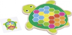 Das Holzpuzzle Schildkröte von der Marke Goki ist ein unterhaltsames und kniffliges Rätsel, bei dem Sie Logik und Geduld einsetzen müssen, um verschiedene Formen nach Vorlagekarten zu legen.