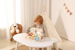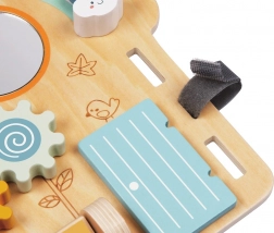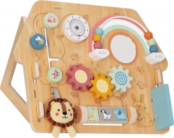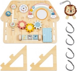 Aktivbrett in Hausform mit Löwenmotiv stimuliert die sensorische Wahrnehmung der Kinder durch sanfte Farben, niedliche Bilder und verschiedene Oberflächentexturen. Kinder lieben Aktivitäten wie das Perlenlabyrinth, dreh- und schiebbare Platten mit Tierbildern. Dieses Spielbrett fördert auch die Hand-Auge-Koordination und die Fantasie.