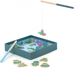 Der Packungsinhalt umfasst 12 hölzerne Magnetfrösche, 2 hölzerne Angelruten mit Magneten und 1 Spielbox/Basis. Dieses Spiel kann ab 2 Jahren gespielt werden und ist ideal für 2 Spieler.