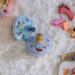 Traditioneller Metallkreisel mit niedlichen Illustrationen von Sarah Betz bietet nicht nur Spaß, sondern fördert auch manuelle Fertigkeiten und das Verständnis grundlegender physikalischer Phänomene.
