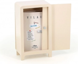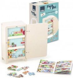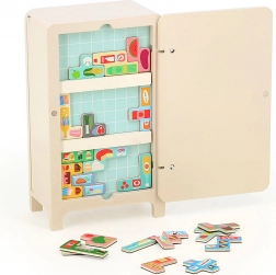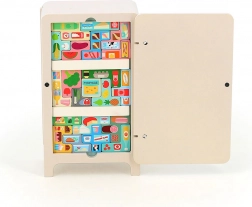 Das Spiel mit dem Design von Ingela P. Arrhenius umfasst einen Holzkühlschrank, zwei magnetische Regale und 21 Lebensmittelmagneten. Kinder können ihre eigene Kühlschrankordnung erstellen, was ihre Kreativität und Problemlösungsfähigkeiten fördert. Die Anleitung bietet 7 verschiedene Lösungen.