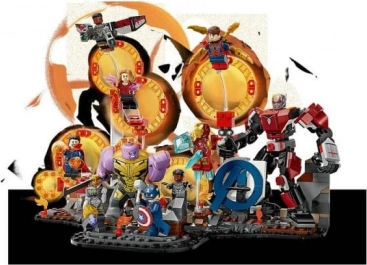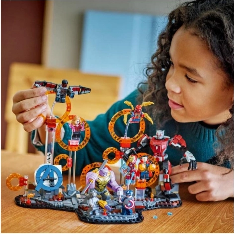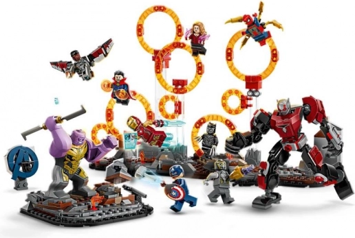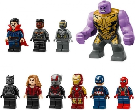 Neun detailreiche Minifiguren, darunter Captain America, IRON MAN, SCARLET WITCH, DOCTOR STRANGE, IRON SPIDER, BLACK PANTHER, FALCON und CHITAURI, plus eine große THANOSE-Figur und ein beweglicher ANT-MAN-Mech eröffnen unbegrenzte Story-Möglichkeiten.