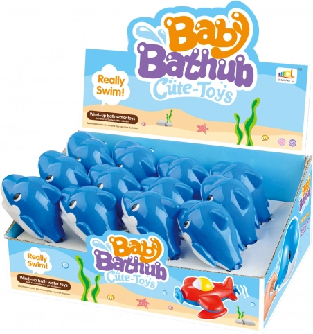 Aufziehbarer Delfin für Wasser, lustiges Spielzeug für Badewanne oder Pool. Abmessungen 12 x 6 x 8 cm, in der Verpackung 12 Stück.