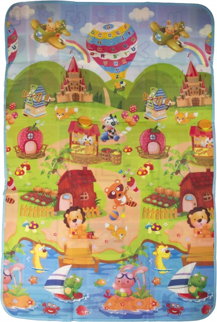Die andere Seite der Matte mit einem Märchendorf und einem Heißluftballon fördert die kindliche Fantasie und Kreativität.