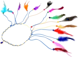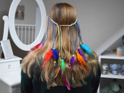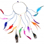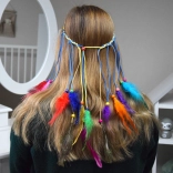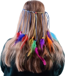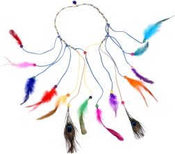 Verleihen Sie Ihrem Stil ein farbenfrohes Upgrade mit diesem wunderschönen Boho-Haarband. Es ist aus leichten, bunten Federn in intensiven Farben gefertigt - von Türkis und Gelb bis Rot und Grün. Die Kombination mit kleinen, hölzernen Perlen und dünnen Zöpfen sorgt für ein effektvolles und natürliches Aussehen.