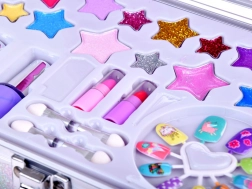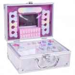 Der Koffer enthält alles, was Sie für ein lustiges Make-up benötigen: Nagellack, Lippenstifte, Lidschatten, Applikatoren, Klebenägel und Aufkleber. Für einfacheres Schminken ist innen auch ein Spiegel.