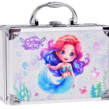 Entdecken Sie den Zauber des glitzernden Schminkkoffers verziert mit Meerjungfrauengrafiken, die mit ihren pudrigen Farbtönen und einer glänzenden Schicht beeindrucken. Dieser kompakte Koffer verfügt über robuste Metallelemente, die vor Beschädigungen schützen, und eine silberne Schnalle für sicheres Verschließen. Ein praktischer Plastikgriff oben erleichtert das Tragen.