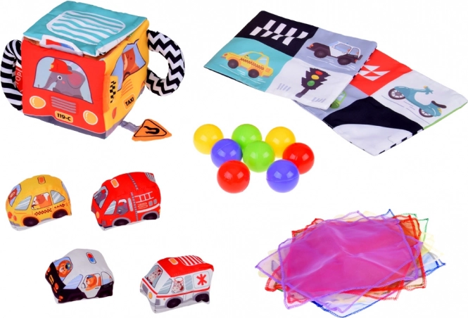 Textilautos, die sanfte Geräusche machen, stimulieren Gehör und Vorstellungskraft.