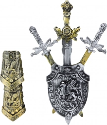 Dieses Set enthält drei verschiedene Ritterschwerter, darunter ein größeres, die Hauptwaffe des Kriegers, ein verziertes Schild mit einem heraldischen Motiv und zwei Armschützer, die Teil einer Rüstung nachahmen. Alle Teile sind aus leichtem, aber haltbarem Kunststoff gefertigt, der sicher und widerstandsfähig gegen intensives Spielen ist.