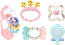 Der Set umfasst 5 verschiedene Elemente, die sowohl als Beißringe als auch als Rasseln fungieren. Mit unterschiedlichen Formen, Farben und Texturen lernt das Kind, Geräusche, Formen und Materialien zu erkennen, entwickelt gleichzeitig seine Koordination von Sehen und Bewegung sowie die Sinne des Tastsinns, Gehörs und Sehens. Die ergonomische Form und Leichtigkeit der Elemente erleichtern es dem Kind, das Spielzeug leicht zu greifen und zu halten.