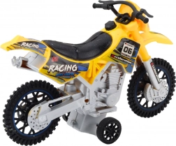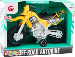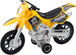 Dieses Motorrad besteht aus robustem Kunststoff, der intensives Spielen aushält. Gelbe Farbe und Rennaufkleber sorgen für ein attraktives Erscheinungsbild, während große Geländereifen Stabilität auf unebenen Oberflächen bieten.