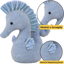 Das blaue Seepferdchen besticht durch sein bis ins kleinste Detail ausgearbeitetes Aussehen. Es hat sichere Augen, eine sorgfältig geformte Schnauze und einen effektiv strukturierten Kamm, wodurch es realistisch und ästhetisch aussieht.