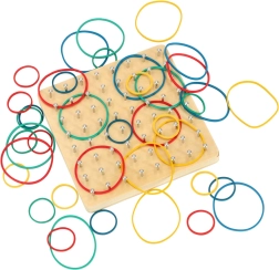 Die glatt geschliffene Holzplatte ohne scharfe Kanten und die Stifte mit abgerundetem Abschluss sorgen für sicheres Spielen und verhindern das Abrutschen der Gummibänder.