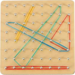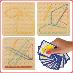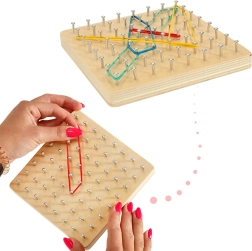 Entdecken Sie eine unterhaltsame Methode, Kinder mit den Grundlagen der Mathematik vertraut zu machen – Formen, Winkel und Symmetrien. Auf der Holzplatte mit dichtem Raster spannen Kinder Gummibänder in verschiedenen Längen und Farben und erstellen Muster nach Karten oder eigener Fantasie. Das Spiel stärkt die Hand-Auge-Koordination, die Konzentration und das logische Denken.
