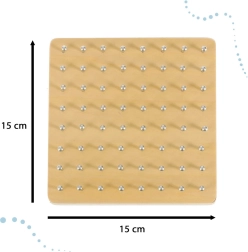 Die Platte besteht aus glatt geschliffenem Holz ohne scharfe Kanten. Die Metallstifte haben ein abgerundetes Ende, das vor Kratzern schützt und hilft, die Gummibänder an Ort und Stelle zu halten. Dank der kompakten Abmessungen eignet sich das Geobrett sowohl für zu Hause als auch für unterwegs.