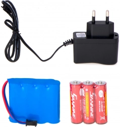 Enthalten sind ein 4,8‑V‑700‑mAh-Akku, ein Netzladegerät sowie Batterien für den Sender (3× AA). Auspacken und losfahren.
