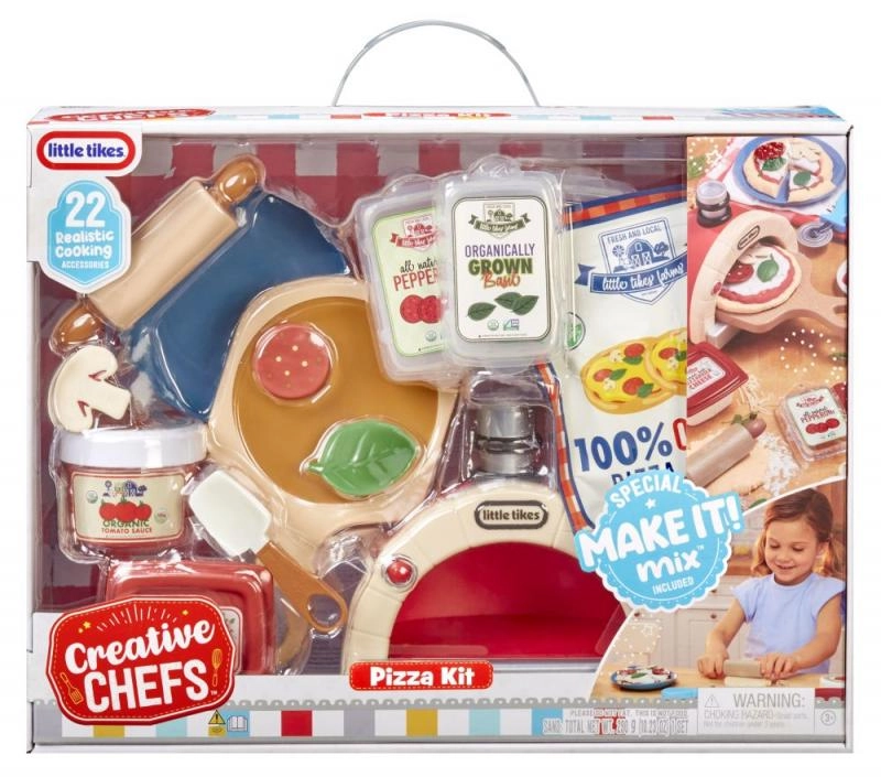 Das Creative Chefs Pizza Kit bietet Kindern ein authentisches Erlebnis der Pizzazubereitung – vom Ausrollen des „Teigs“ über das Würzen bis hin zum Schneiden und Servieren. Der Mini-„Ofen“, das Zubehör und die farbenfrohen Zutaten regen die Fantasie an, vermitteln Küchenabläufe und fördern die Feinmotorik.