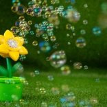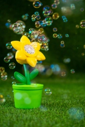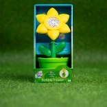 Das Design in Form einer gelben Blume in einem grünen Blumentopf fällt sofort ins Auge und verwandelt jedes Spiel in eine fröhliche Show voller Seifenblasen.