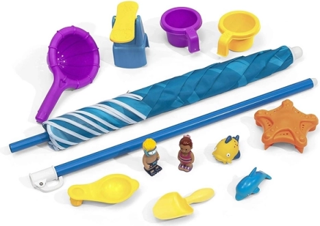 Dieser Tisch enthält viele Spielaccessoires, darunter ein Netz, Sprungbretter ins Wasser, drei Becher, vier Figuren und einen Seestern-Wasserspinner. Der Wassertank oben hat ein Fassungsvermögen von 7,57 Litern und der untere 11,30 Litern. Das Design des Produkts ermöglicht einfache Montage und Stabilität.