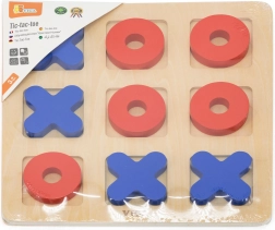 Im Set enthalten ist ein hölzernes Spielfeld für das Tic Tac Toe Spiel und insgesamt neun bunte Holzelemente - vier blaue 'X' und fünf rote 'O'.