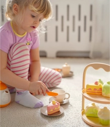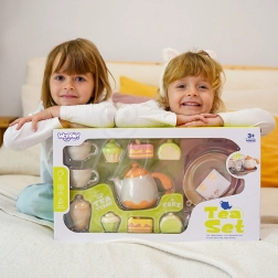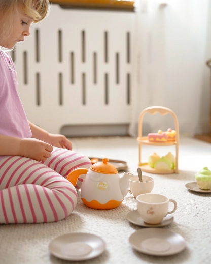 Mit diesem niedlichen WOOPIE Tee-Set tauchen Kinder spielend in die Welt der Erwachsenen ein – sie veranstalten eigene Teerunden, laden Familie und Freunde ein und lernen Teilen und Höflichkeit. Die reichhaltige Ausstattung mit Teekännchen, Tassen mit Untertassen, Löffeln und Desserts fördert kreative Rollenspiele und regt die Fantasie an.