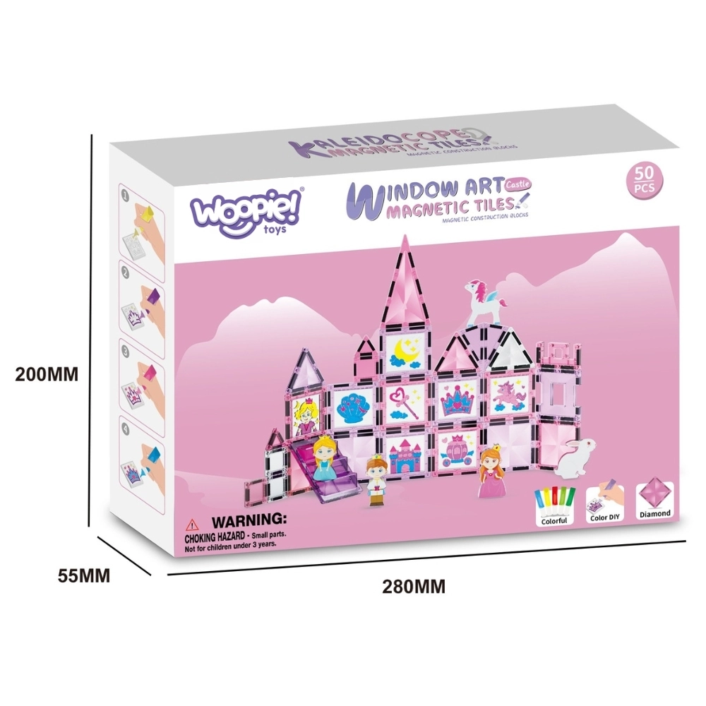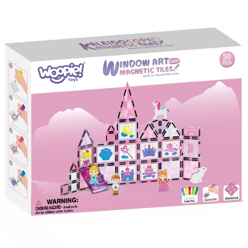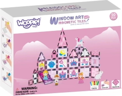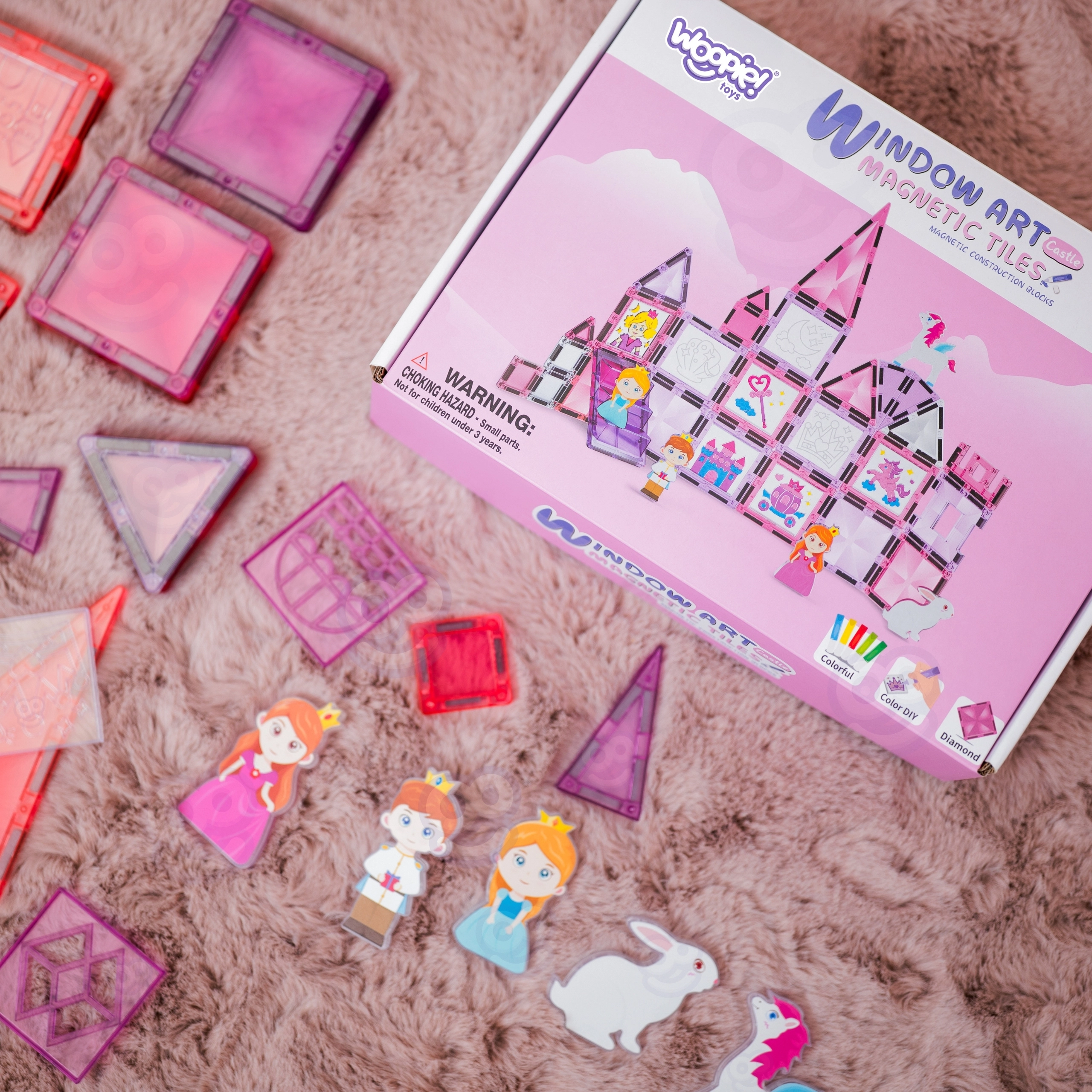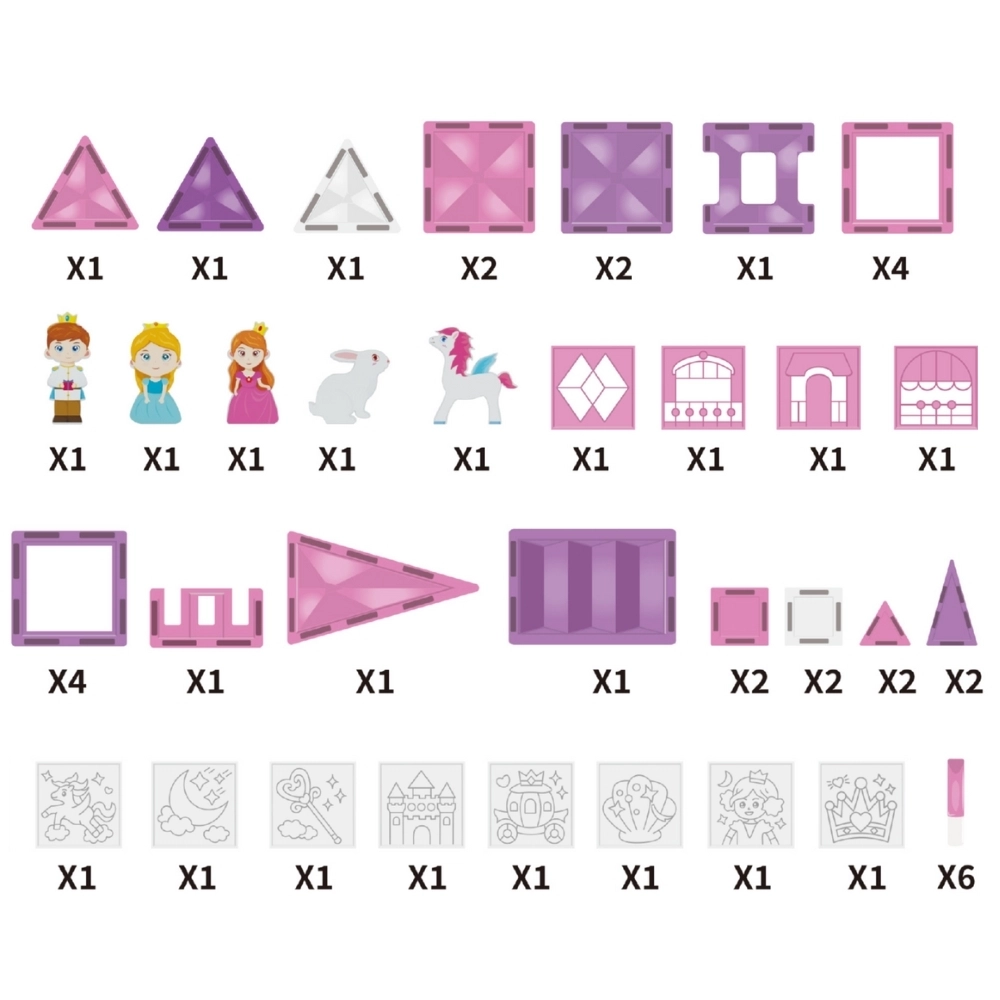 Dieses rosafarbene und lilafarbene Set aus magnetischen Plättchen und Zubehör verwandelt Kinderfantasie in echte Paläste, Türme und Tore. Teile mit Fenstern, Dächern und dekorativen Aufdrucken lassen sich dank der starken Magnete leicht verbinden, sodass die Bauwerke ihre Form behalten und Kinder ohne Frust spielen können.