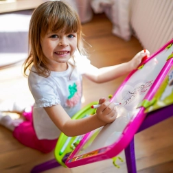 Leichte und stabile Konstruktion mit Ablagefach für Zubehör, damit alles griffbereit bleibt. Geeignet ab 3 Jahren und ideal zur Förderung von Kreativität, Hand-Auge-Koordination und Zusammenarbeit beim gemeinsamen Gestalten. Die fluoreszierende Funktion wird mit AAA-Batterien betrieben.