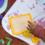 Ausmalen und Stempeln nur mit Wasser. Farbspuren erscheinen, trocknen nach wenigen Minuten und verschwinden – die Unterlage ist wieder einsatzbereit.