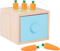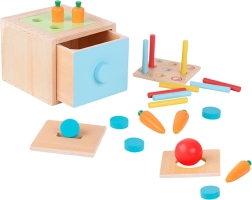 • - Enthält 26 Teile: Schublade, 4 Sortiereinsätze, 1 roter Ball, 5 Scheiben, 5 Karotten, 9 Stäbchen in drei Farben