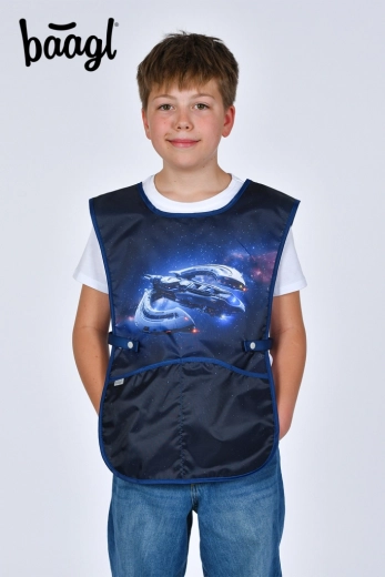 Suchen Sie zuverlässigen Schutz für die Kleidung beim Basteln? Die Kinder-Schürze von Baagl mit dem attraktiven Motiv Raumschiff passt Kindern hervorragend und hält Schmutz beim Malen, Kleben und Modellieren stand. Die abwaschbare Oberfläche ist leicht zu pflegen und die zwei Vordertaschen bieten Platz für Pinsel, Stifte und Taschentücher.