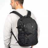 Die praktische Ausstattung umfasst eine integrierte Laptoptasche, ein Brillenfach, einen Innenorganizer mit Schlüsselkarabiner und einen Gurt zur Befestigung am Reisekoffer. Das zeitlose Design in Schwarz wirkt clean und modern und passt zu älteren Schülern, Studierenden und Erwachsenen.