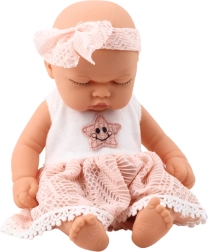 Schlafende Babypuppe in rosa Kleid mit Spitze und passendem Stirnband ist eine niedliche Wahl für Kinder, die Rollenspiele lieben und alltägliche Aktivitäten von Erwachsenen nachahmen möchten.