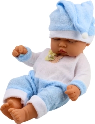 Die Puppe hat eine kompakte Größe von ungefähr 24 x 12 cm, was sie ideal für Kinderhände macht. Das Pyjama ist aus weichem Material in einer schönen blauen Farbe, ergänzt durch eine niedliche Mütze mit Bommel. Ein kleiner Aufdruck auf dem T-Shirt mit einem Schnuller-Motiv verleiht der Puppe einen sanften, kindlichen Charme.