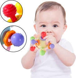 Das eingebaute Rasselspielzeug ertönt sanft bei Bewegung, was die Hörentwicklung fördert und die Aufmerksamkeit des Kindes auf sich zieht. Die kompakte Größe und die für kleine Hände geeigneten Griffe ermöglichen ein einfaches Greifen, Drehen und Drücken, wodurch die Koordination und die Greifkraft trainiert werden.