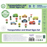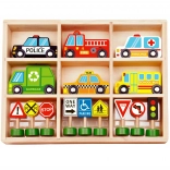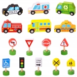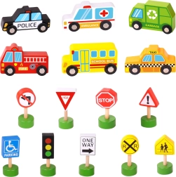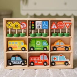 Das Set enthält 6 Fahrzeuge, eine Ampel und 8 Schilder, die Kindern helfen, sich die grundlegenden Regeln des Straßenverkehrs auf natürliche Weise anzueignen.